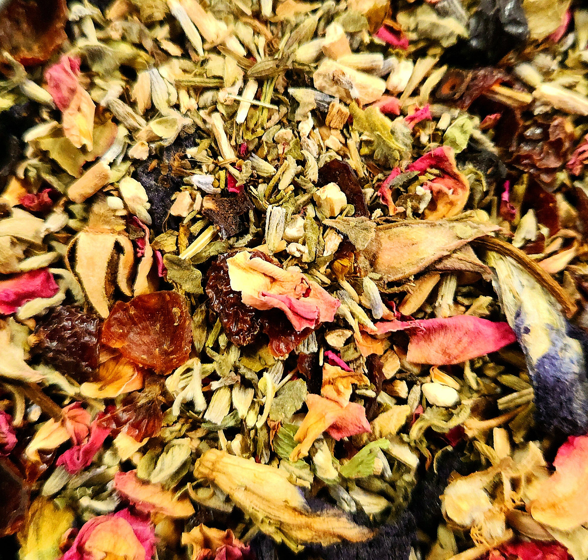 Organic Damiana Leaf, Organic Red Rose Buds & Petals, Organic Lavender Flowers, Organic Lemon Balm, Organic Rosehips, Organic Butterfly Pea Flower, Organic Ashwagandha Root, Organic Stevia Leaf