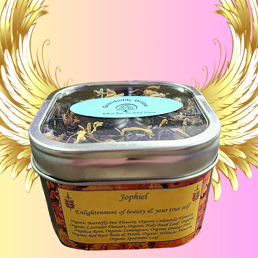 This organic tea blend contains herbs to help draw in the energies of Archangel Jophiel. Flowers such as butterfly pea flowers, roses, calendulas, and hibiscus are symbols of outer beauty that also promote skin and oral health. Herbs such as lavender, holy basil, angelica root, and orange peel help enlighten you to your true self and spiritual path. This blend helps to bring the golden light of Archangel Jophiel when negatives are piling up.