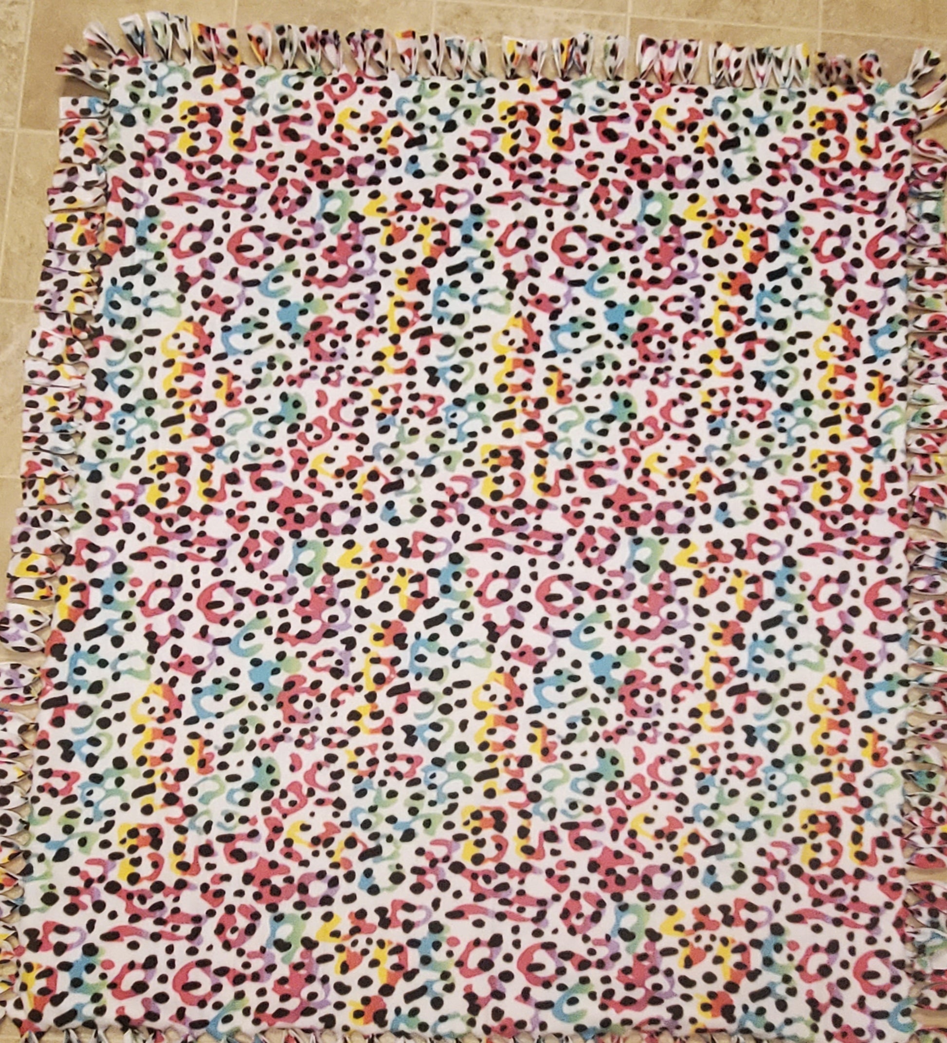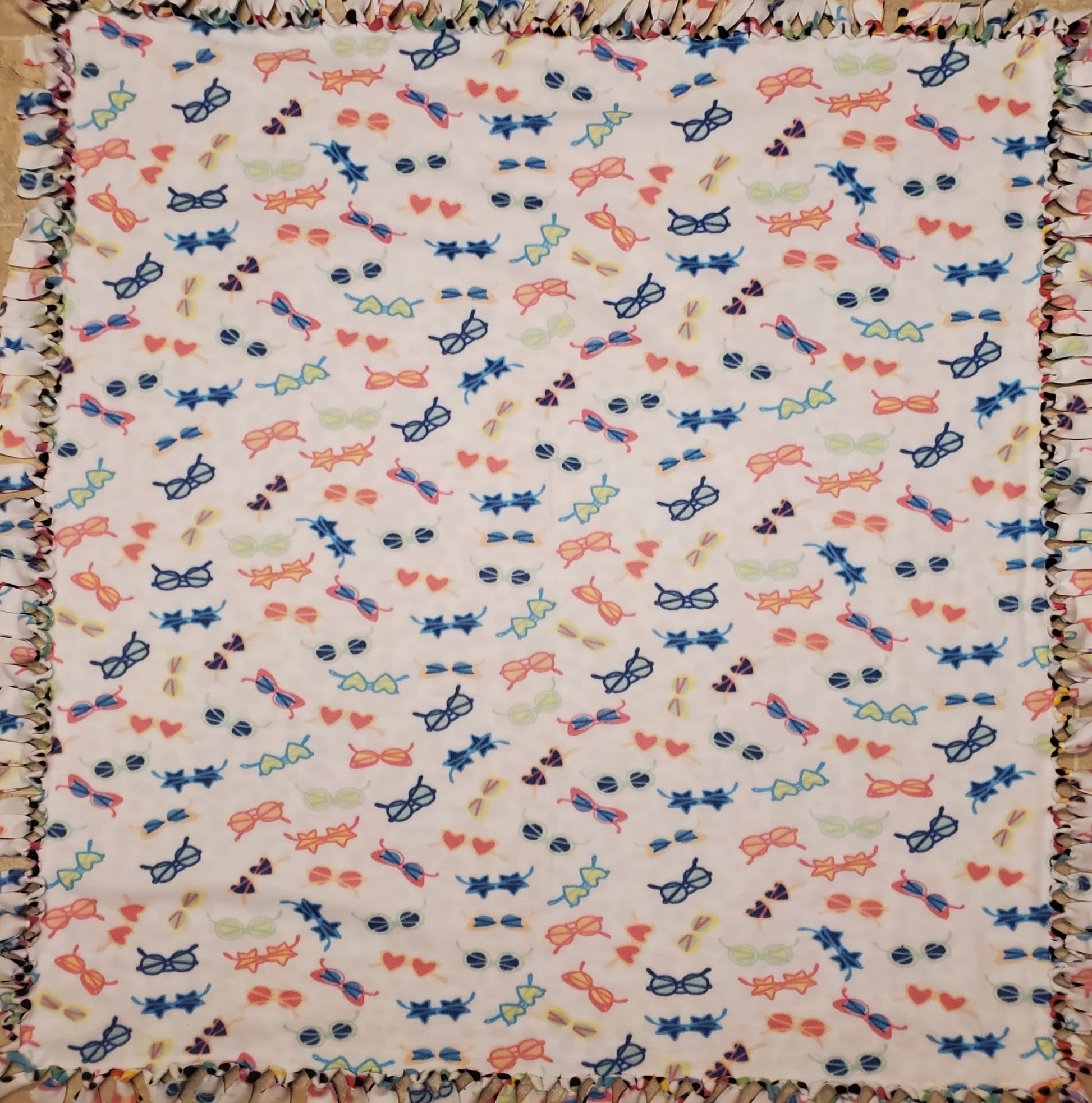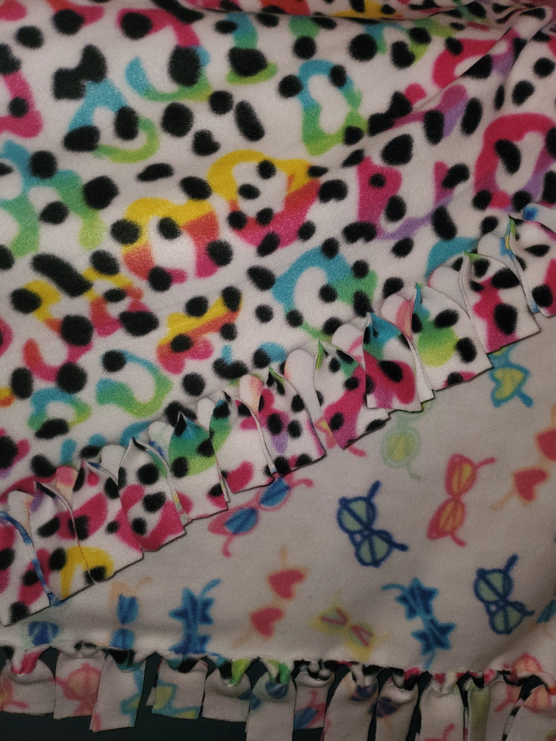 This unique blanket features one side with colorful sun shades and the other with cheetah print on bright colorful shapes