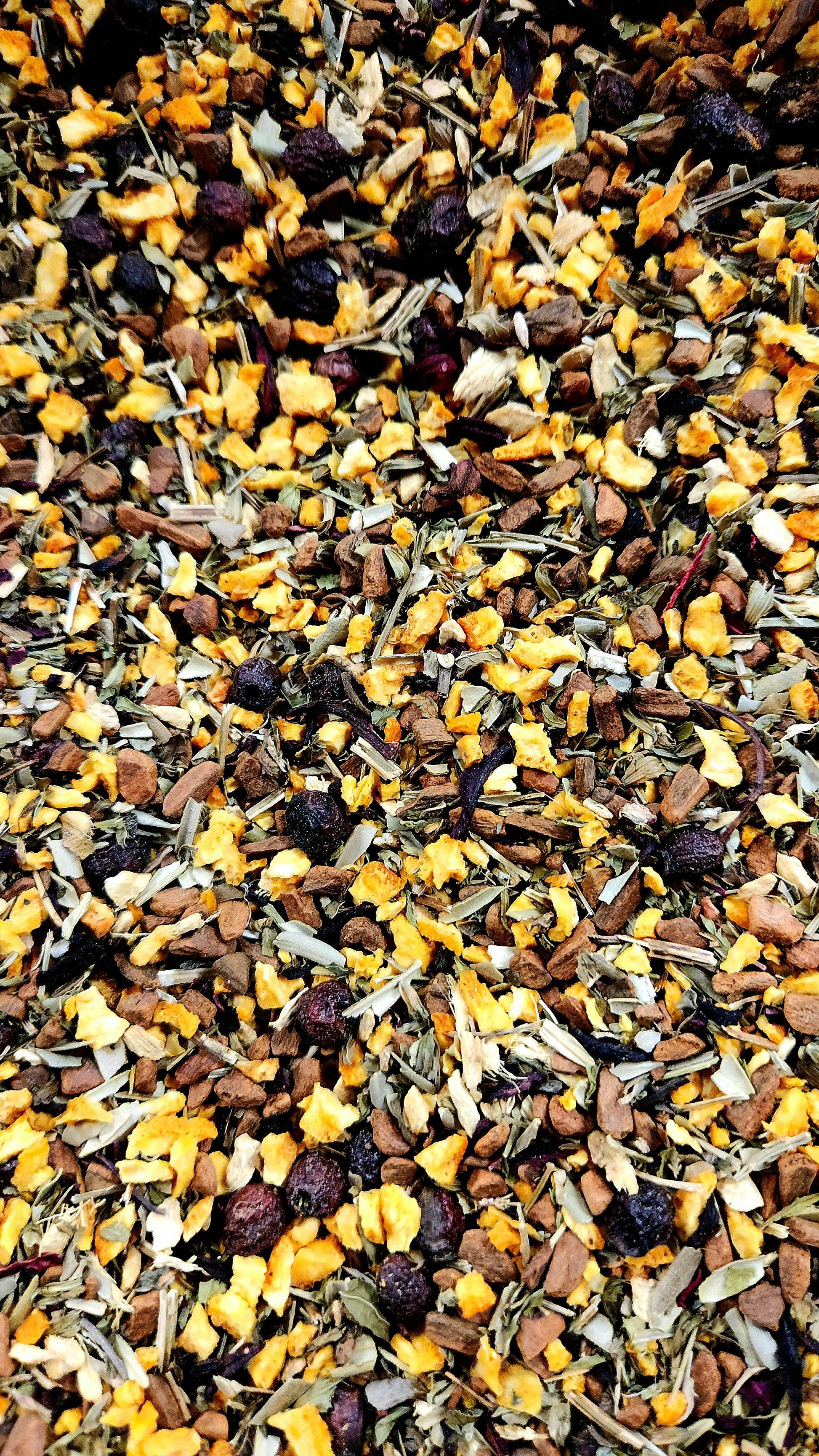 Enjoy the delicious cinnamon and orange flavor while reaping the benefits of organic lemon balm, Hawthorne berries, olive leaf, ginger root, hibiscus, and spearmint.